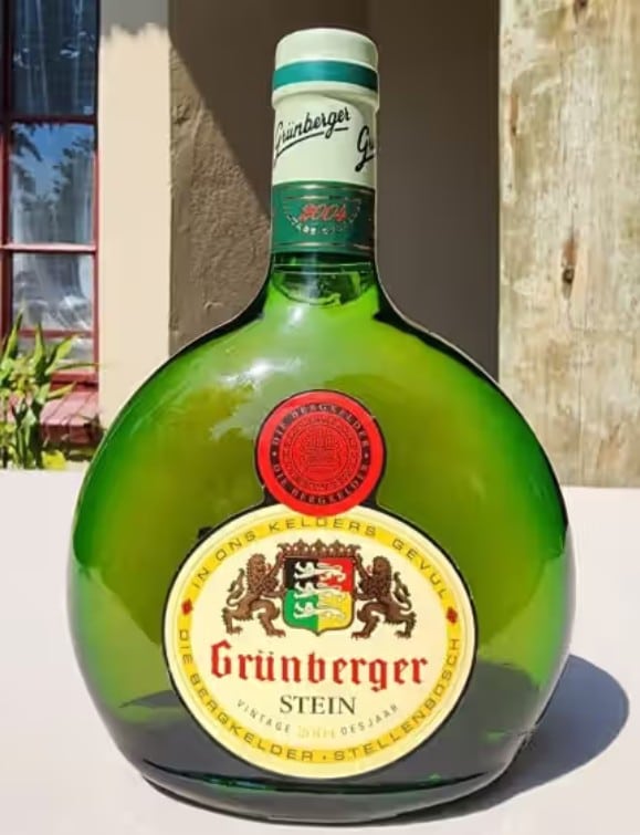 There was a time when Grünberger Stein was one of South Africa’s biggest sellers, alongside Nederburg Stein, Bellingham Johannisberger, and Graça. The “stein” category, signifying semi-sweet white table wine, has largely if not entirely disappeared; its time has gone. The Grünberger Stein bottle shared its distinctive flagon shape with its partners Freudenlese and Rosenlese. Interestingly, another brand in that topselling category had a related form: Bellingham Johannisberger also came in a flattened bottle, but with cascading curves that reputedly approximated the silhouette of the Groot Drakenstein behind the original Bellingham homestead. It later moved into a boringly standard flint bottle, flaunting the name “Legacy”, and I’m not sure it long survived the transformation. Certainly the Grünberger label and bottle have long since disappeared – around 2010, I think.